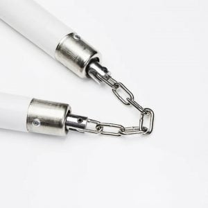 Nunchucks are martial arts weapons that consist of two sticks connected at one end by a chain or rope. The length of the sticks and the length of the chain or rope will vary depending on the size and weight of the nunchucks.